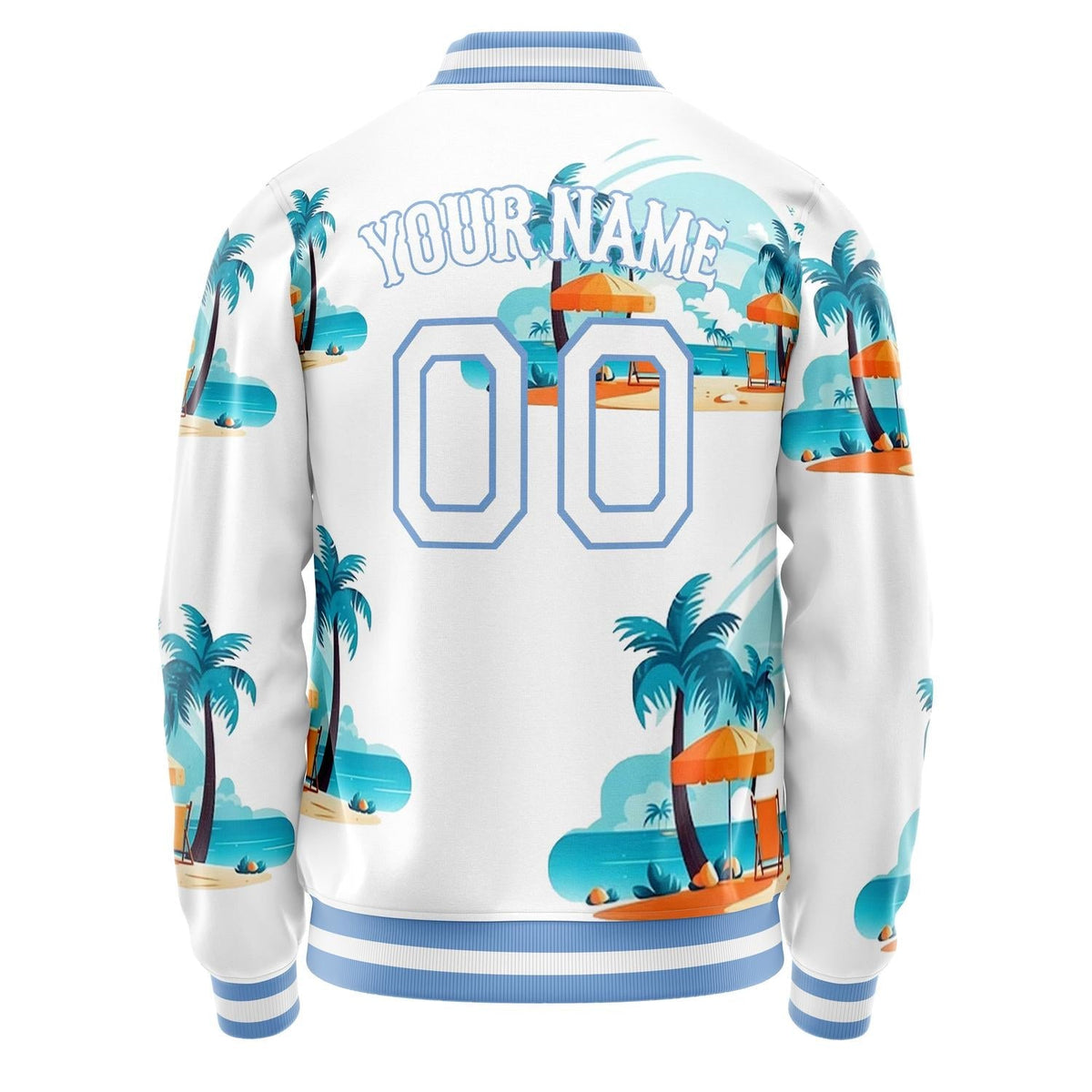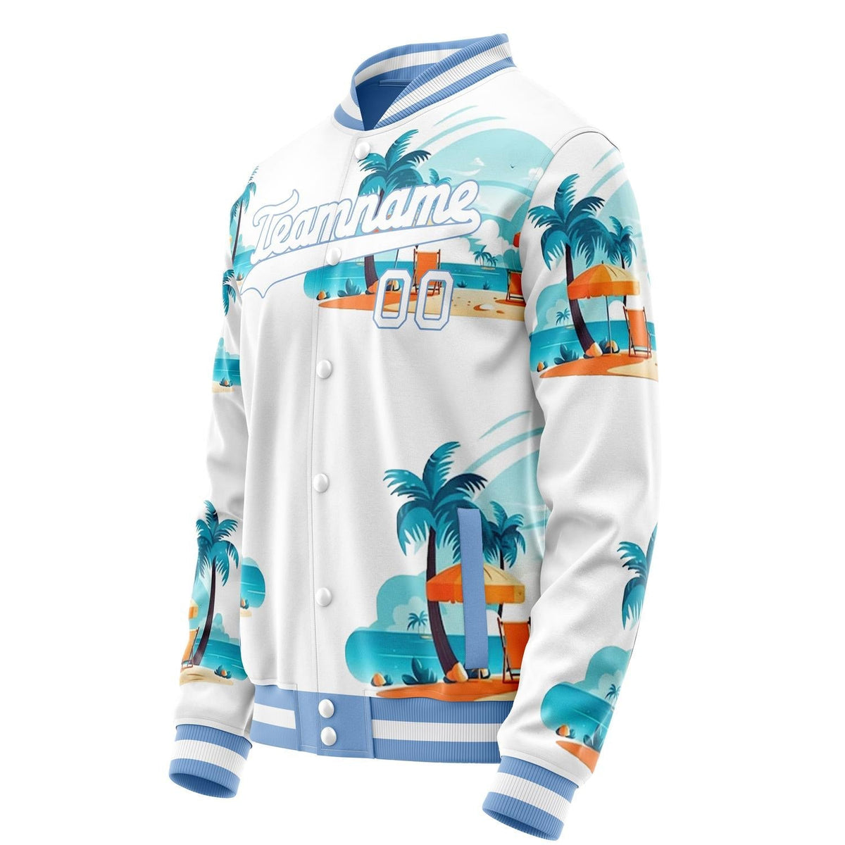 Custom White Light-Blue 3D Pattern Hawaiian Palm Tree Flamingo Varsity Letterman Jacket